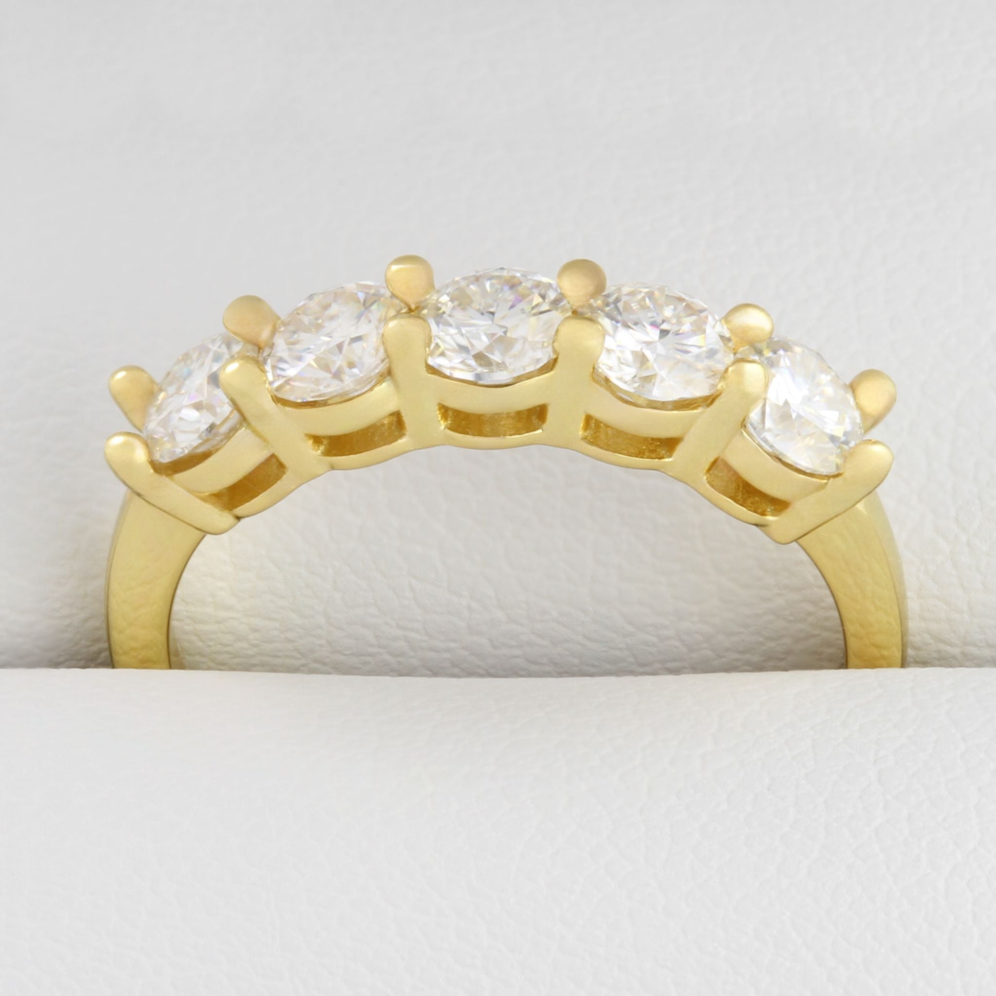 Experience the thrill of wearing a diamond ring - at a fraction of the price. Our premium grade Moissanite stones are impossible to tell apart from real diamond. This Dazzle ring has a series of five chunky Moissanite stones sat part way around the ring.
