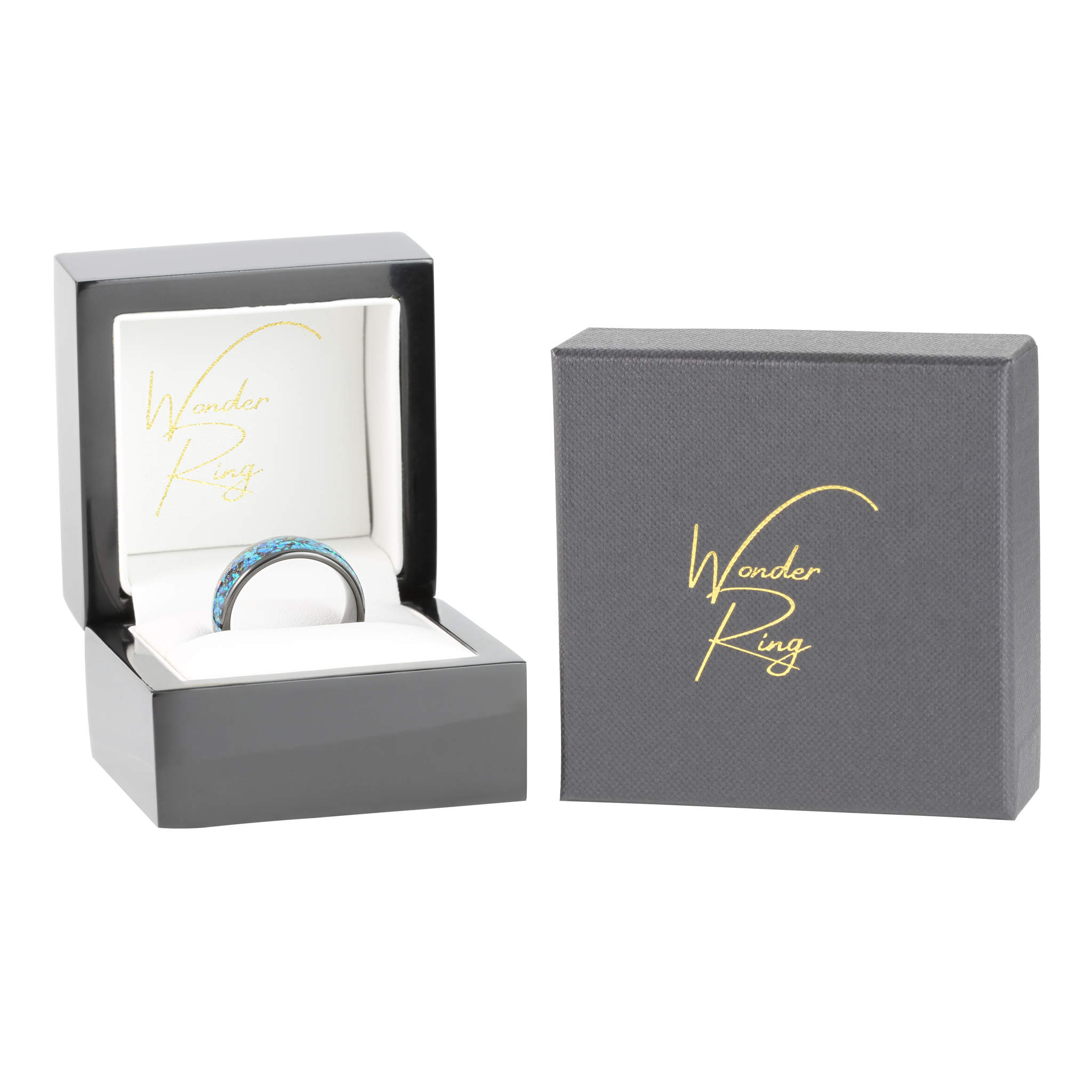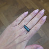 The Black Opal Wonder Ring is based on the Black Wonder Ring and features a central band of crushed blue and green opal. The ring is 8mm wide and has a highly polished domed exterior.
