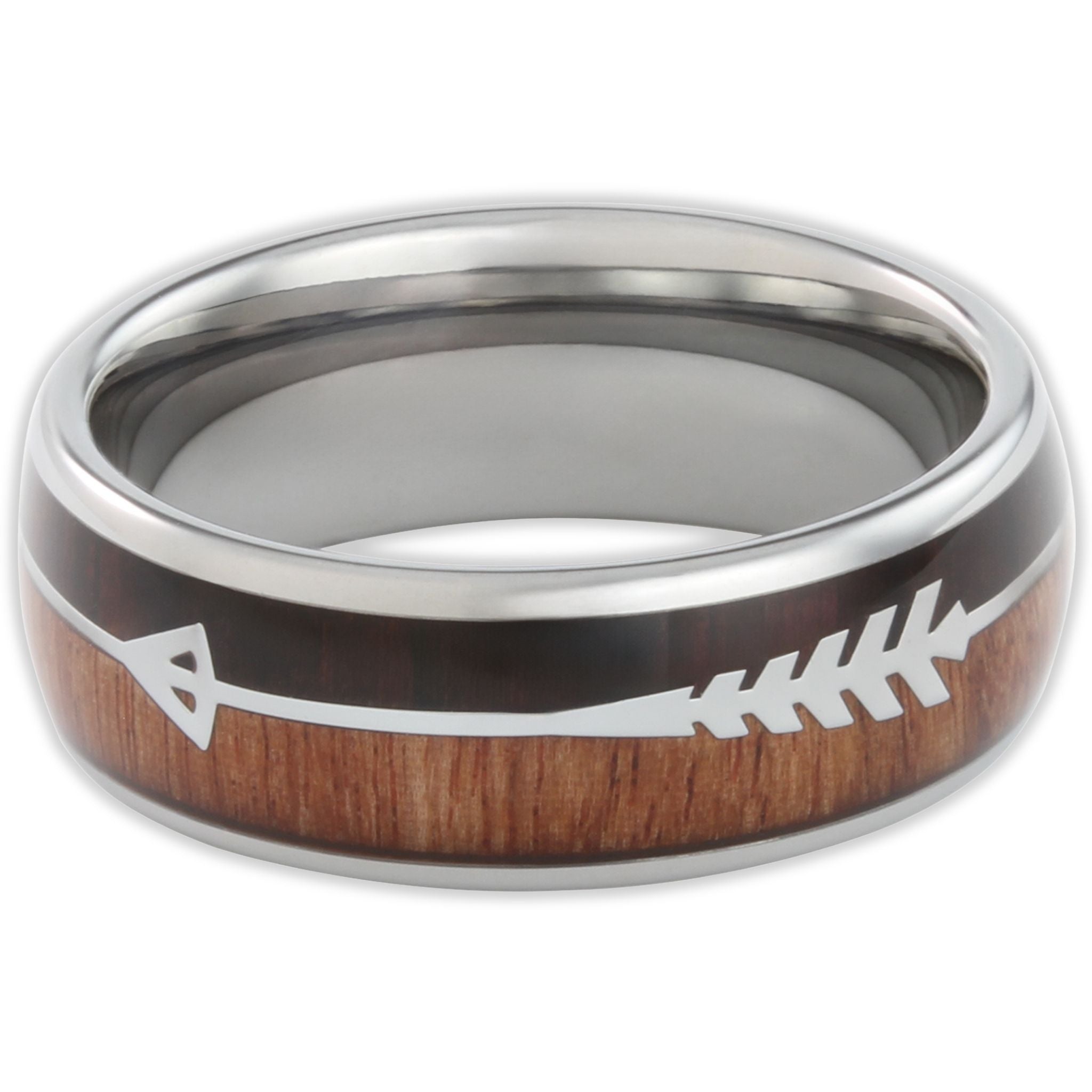 This ring features a stainless steel arrow design, overlaying a two-tone wood background. A symbol of the bow and arrow that ended the Anglo-Saxon era of England.